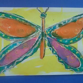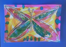 Make wax resist dragon flies - My home school art class consists of children ages 8 to 12. These babes come to the Museum to create art. I am there to guide them and provide materials to facilitate their output of creativity. This week I showed them how to draw butterflies and dragonflies by beginning with a large letter x and building from there. After they were drawn, we outlined them in crayon. Next we put the first color over the paper (yellow or pink). We then colored more of the butterfly with a clear wax crayon. We followed that with more layers of watercolors. You can see that some of the crayon resisted the original color from being touched and is visible through the blue or darker washes. This is a similar technique to batik on cloth. I love the texture of these paintings. The children were very proud of their results. They had great fun painting all of the beautiful colors over their drawings. It was kind of like magic.
